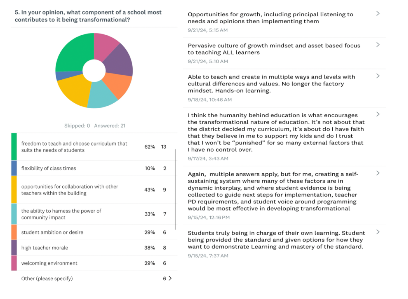 On the other hand, transformational is noted as “developmental change,” innovative information creation,” “sparking a fire,” “different perspectives for engagement,” “growing and improving,” “critical thinking, personal growth & deeper understanding, “relevant knowledge transfer,” and “inspiration,” with many educators alluding to the word change. Respondents were able to select multiple responses for what makes education transformational, and thirteen (62%) indicated that freedom to teach and choose curriculum that fits the student need is a defining factor. Eight respondents (38%) saw high teacher morale as a characteristic of a transformational school while seven individuals (33%) identified that transformational education harnesses the power of the community. Other responses have been captured in the graphics below.